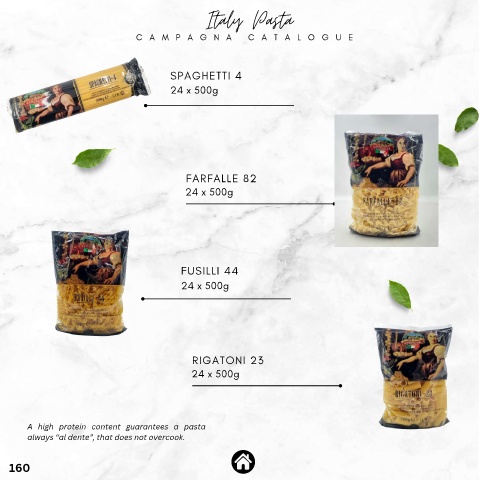 Italy Pasta C A M P A G N A C A T A L O G U E SPAGHETTI 4 24 x 500g FARFALLE 82 24 x 500g FUSILLI 44 24 x 500g RIGATONI 23 24 x 500g A high protein content guarantees a pasta always “al dente”, that does not overcook. 160