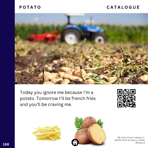 P O T A T O C A T A L O G U E Today you ignore me because I’m a potato. Tomorrow I’ll be french fries and you’ll be craving me. 38 Jalan Pusat Industri 1 88450 Kota Kinabalu, Sabah 168 Malaysia