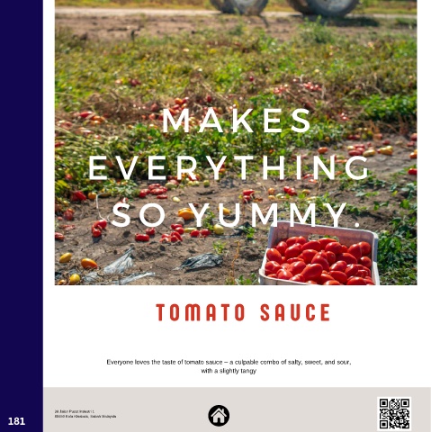 M A K E S E V E R Y T H I N G S O Y U M M Y . T O M A T O S A U C E Everyone loves the taste of tomato sauce – a culpable combo of salty, sweet, and sour, with a slightly tangy 38 Jalan Pusat Industri 1 181 88450 Kota Kinabalu, Sabah Malaysia
