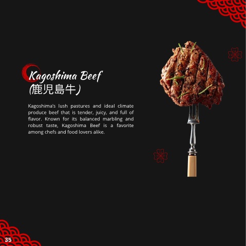 Kagoshima Beef (⿅児島⽜) Kagoshima’s lush pastures and ideal climate produce beef that is tender, juicy, and full of flavor. Known for its balanced marbling and robust taste, Kagoshima Beef is a favorite among chefs and food lovers alike. 35