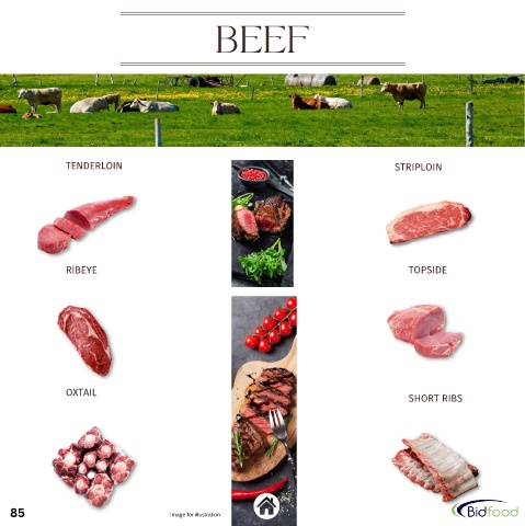 B E E F BEEF Image for illustration only. TENDERLOIN STRIPLOIN RIBEYE TOPSIDE OXTAIL SHORT RIBS 85 Image for illustration